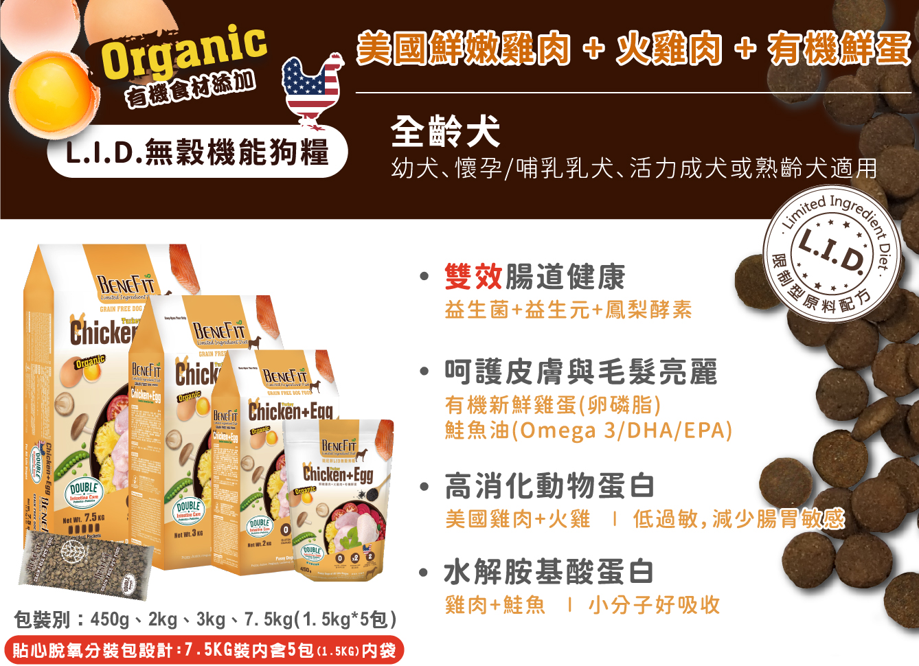 Omega3 0.4%、Omega6 2.5%、L-離胺酸1.5%、維生素A 12,000IU/kg、維生素D 1,000IU/kg、維生素E 150IU/kg