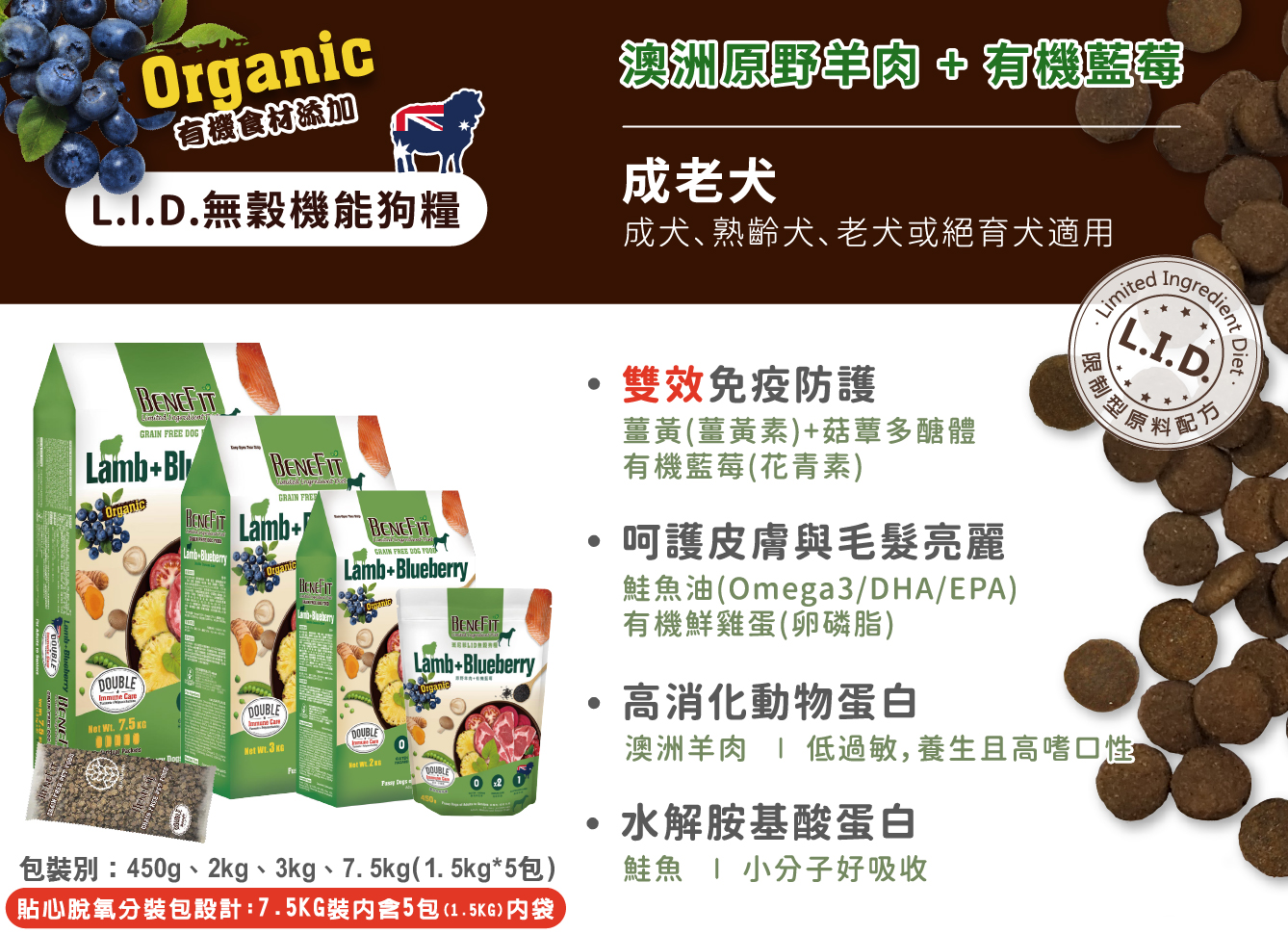 脫水肉粉(羊肉,軟骨素來源)、木薯、豌豆、蔬果纖維(甜菜、芝麻、蘋果、蔓越莓、地瓜葉、番茄、胡蘿蔔、花椰菜)、雞脂(飽和脂肪酸與Omega9&6/LA/ALA來源)、芥花油(Omega6/LA/ALA來源)、鮭魚油(Omega3/ALA/DHA/EPA/AA來源)、水解胺基酸蛋白(鮭魚)、胺基酸(L-賴胺酸、DL蛋胺酸、牛磺酸)、有機藍莓(花青素PACs)、必需礦物質(鈣、磷、鉀、鈉、鐵、鋅、銅、錳、硒)、乳酸鈣、綜合維生素(氯化膽鹼、維生素A、B1、B2、B3、B5、B6、B9、B12、C、E、D3、H)、果寡糖FOS、絲蘭萃取物、枯草芽孢桿菌、鳳梨酵素、葡萄糖胺、薑黃、菇蕈多醣體、天然抗氧化劑(α-生育酚)。