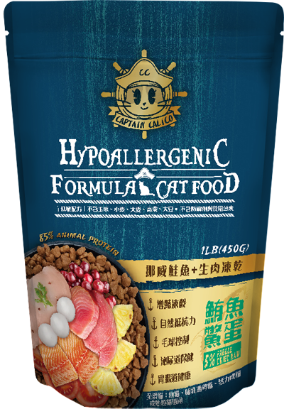 ♦ 嚴選食材:脫水魚肉(鮭魚)、脫水雞肉、糙米、木薯、雞油、雞蛋粉、水解蛋白粉(雞/魚)、甜菜粕、燕麥、植物油(棕櫚油、芥花油)、鮭魚油、魚皮、果蔬類籽實及其製品(亞麻籽、芝麻籽、山藥、牛蒡乾、蔓越莓乾、蕃茄泥、高麗菜乾、胡蘿蔔乾)、蛋(卵磷脂)、礦物質(磷酸二鈣、乳酸鈣、氯化鉀、硫酸亞鐵、氧化鋅、硫酸銅、氧化錳、碘酸鈣、酵母硒)、海藻、螺旋藻、綜合維生素(氯化膽鹼、維生素A、E、C、D3、B1、D-泛酸鈣、B6、核黃素、葉酸、D-生物素、B12、菸鹼酸)、啤酒酵母粉、果寡糖FOS、甘露寡糖MOS、天然類固醇薩灑皂角苷(源自絲蘭)、牛磺酸、蛋白酶(木瓜與鳳梨萃取)、枯草芽孢桿菌、植物乳桿菌、天然抗氧化劑(天然維生素E)。