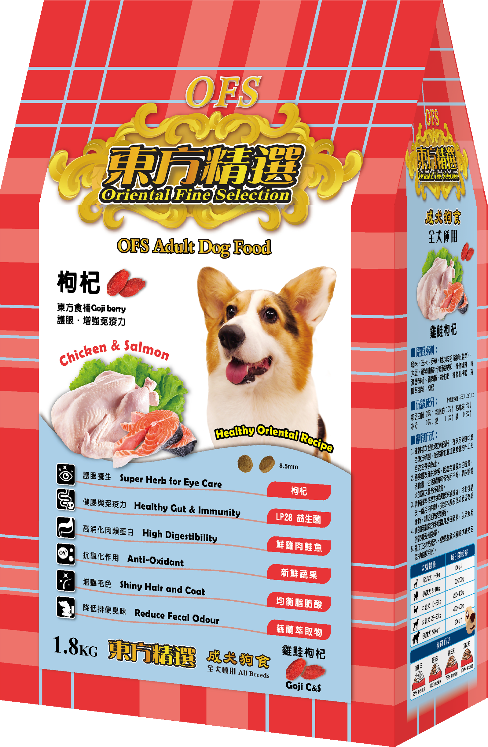 ♦ 嚴選食材:糙米、玉米、麥粉、脫水肉粉(雞肉/鮭魚)、大豆、動物油脂(均衡脂肪酸)、植物纖維、啤酒酵母粉、礦物質、維他命、植物乳桿菌、蕬蘭萃取物、枸杞